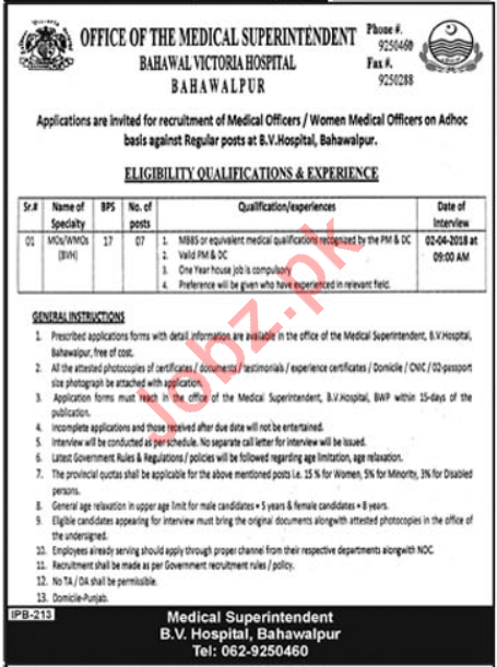 Bahawal Victoria Hospital Bahawalpur Jobs Medical Officers