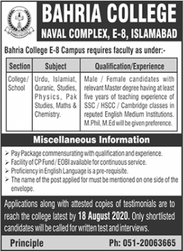 Bahria College Faculty Staff Jobs 2020 In Islamabad