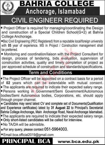 Bahria College jobs advertisement dated about 21 August 2022 in daily Express Newspaper invites application for the vacant post of civil engineer in Islamabad, islamabad Islamabad Pakistan. Preferred Education is Bachelor etc.