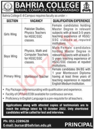 Bahria College invites applications for job positions advertised in daily Jang dated 2 October 2022 for following vacancies in Islamabad, islamabad Islamabad Pakistan.