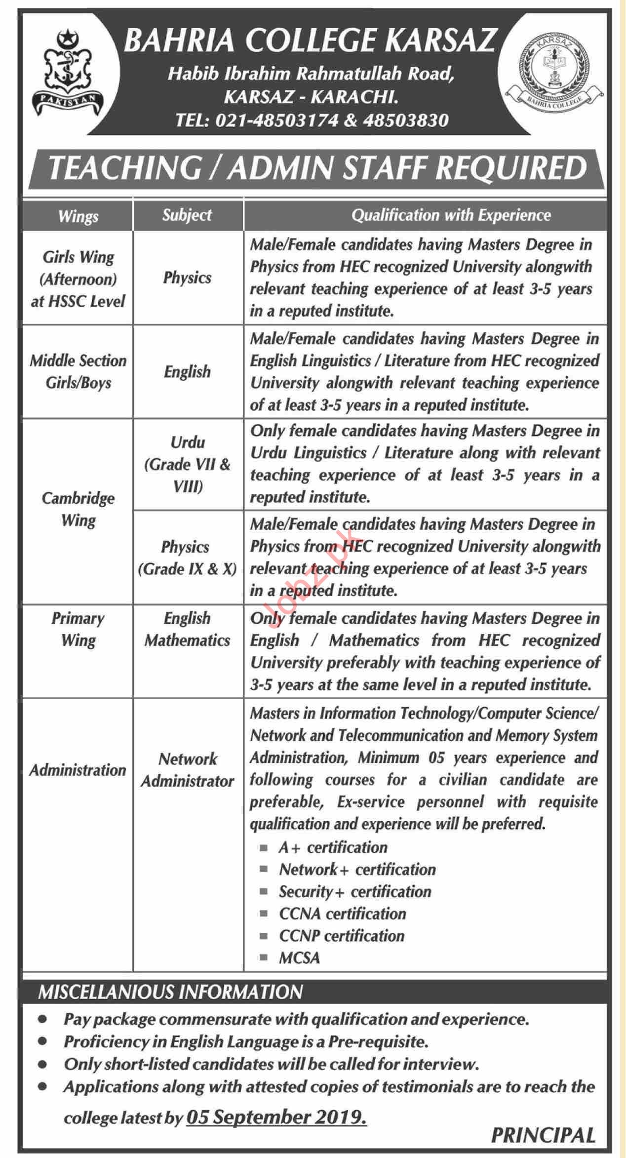 Bahria College Karsaz Jobs For Teaching & Admin Staff