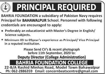 Vacancies in Bahria Foundation College Advertisement September 2020