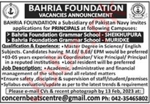 Bahria Foundation Sheikhupura, muridke Punjab Pakistan invites applications from eligible candidates for the post of principal as per advertisement of February 5, 2023 published in daily Jang Newspaper. MA, Master, M.ed, M.sc and B.ed etc. educational qualification will be preferred.