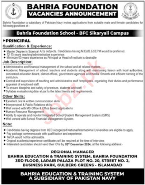 Bahria Foundation is looking for candidates for following posts as per job advertisement published in daily Jang Newspaper of November 24, 2024 for location Islamabad, islamabad Islamabad Pakistan: