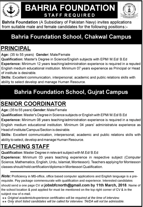 Bahria Foundation School Chakwal Campus Teaching Jobs