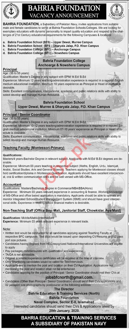 Bahria Foundation School & College, Pakistan Navy, Government of Pakistan seeks candidates for the posts of Principal, Coordinator, Teacher, Montessori Teacher, Primary Teacher, Accountant, Office, Boy, Mali, Gardener, Janitorial Staff, Sanitary Worker, Sweeper, Chowkidar, Aya, Maid.