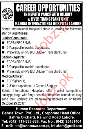 Bahria International Hospital Lahore jobs 2017