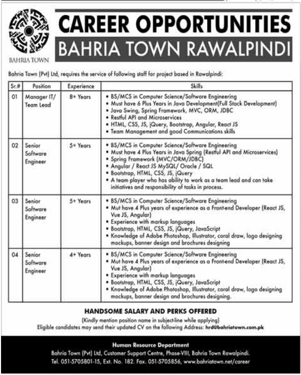 Latest Bahria Town Management Posts Rawalpindi 2025