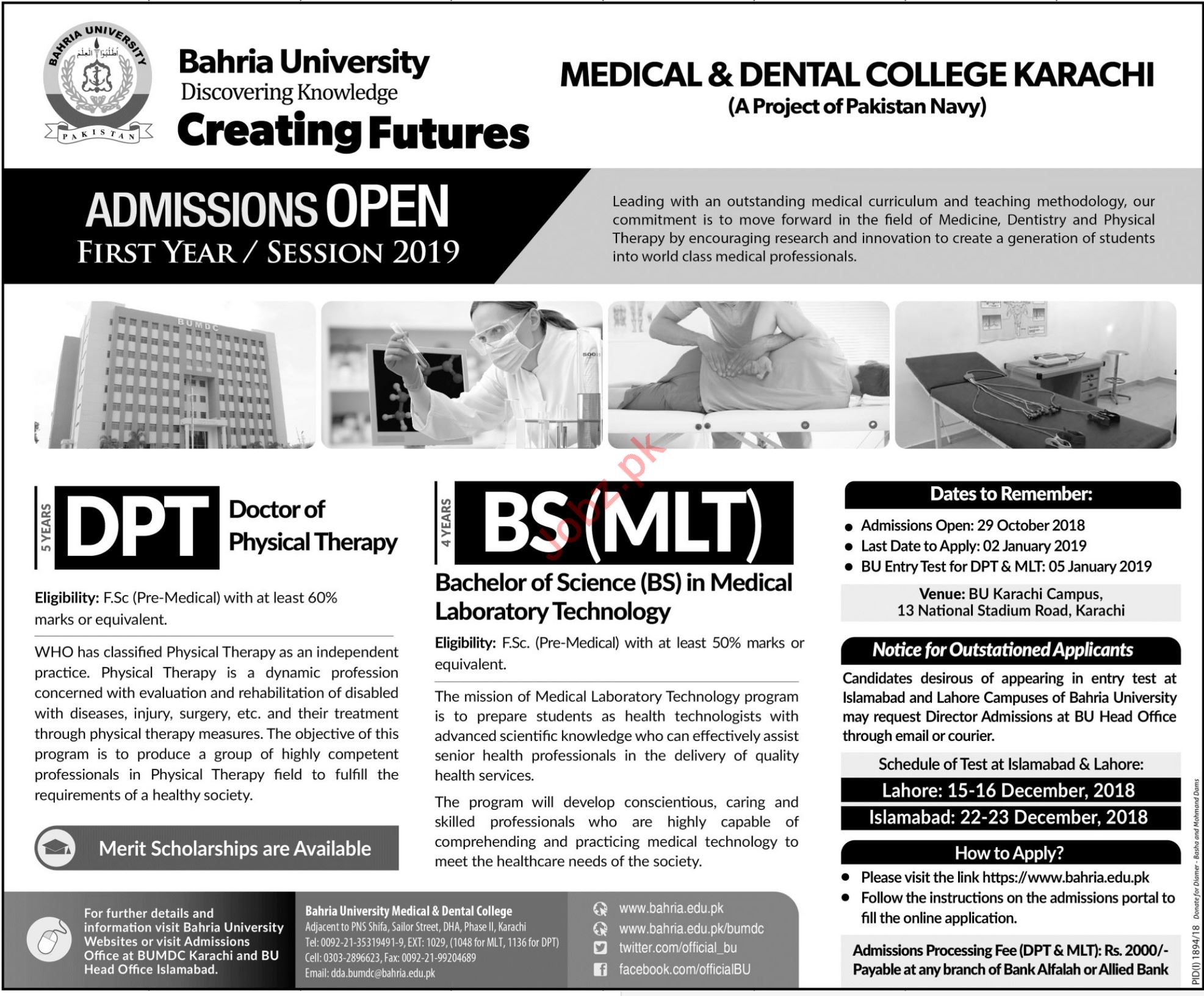 Medical & Dental College Karachi, Bahria University Islamabad, Pakistan are opened admissions 2019 for the classes of DPT (Doctor of Physical Therapy) and BS (MLT). Read newspaper ad for exact details.