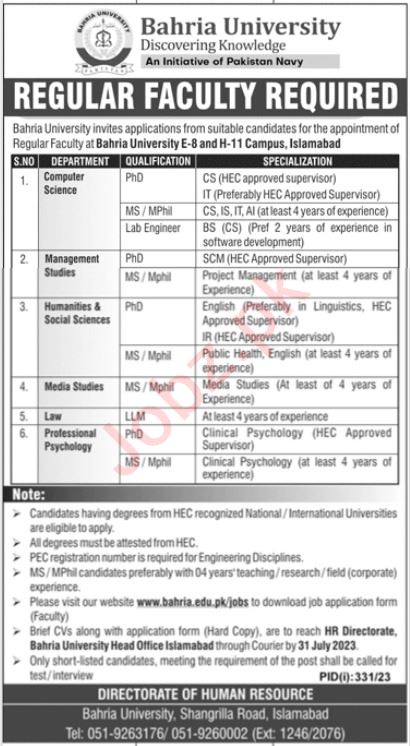 Bahria University is looking for candidates for following posts as per job advertisement published in daily Jang Newspaper of July 16, 2023 for location Islamabad, islamabad Islamabad Pakistan: