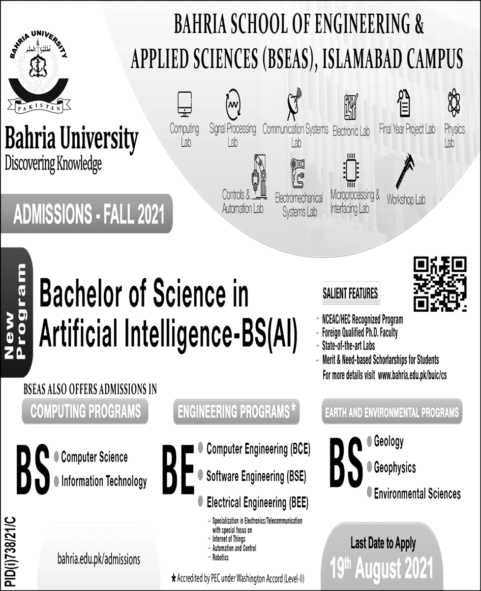 Bahria University is a federally chartered public sector university has announced admissions in Bachelor of Science in Artificial Intelligence BSAI, BS Computer Science, BS Information Technology, BE Computer Engineering, BE Software Engineering, BE Electrical Engineer, BS Geology, BS Geophysics & BS Environmental Sciences. Read newspaper ad for exact details.