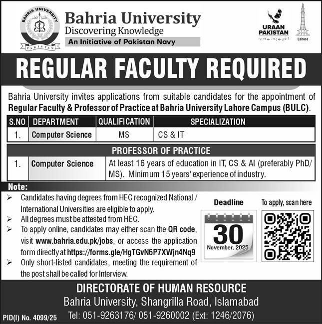 Bahria University jobs advertisement dated about 17 November 2025 in daily Express Newspaper invites application for the vacant post of professor and faculty staff in Islamabad, islamabad Islamabad Pakistan. Master, Bachelor and MS etc. educational qualification will be preferred.