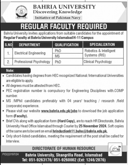 Bahria University Islamabad, islamabad Islamabad Pakistan invites applications from eligible candidates for the post of faculty staff as per advertisement of November 10, 2024 published in daily Jang Newspaper. Preferred Education is Phd, Master, Mphil and Bachelor etc.