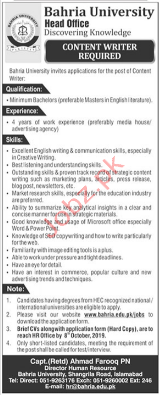 Vacancies in Bahria University Advertisement September 2019