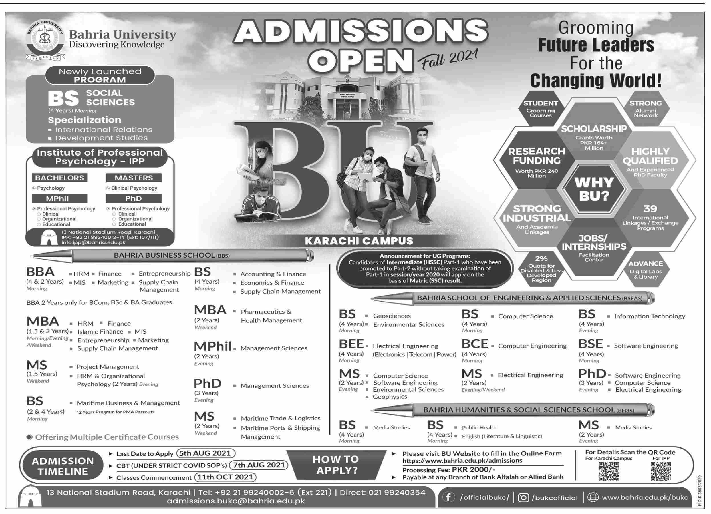 Bahria University is a Federally Chartered Public Sector university has announced admissions in BBA, MBA, MS, BS, M.Phil, PhD, BEE, BCE and BSE degree programs in Karachi campus 2021. Read newspaper ad for exact details.