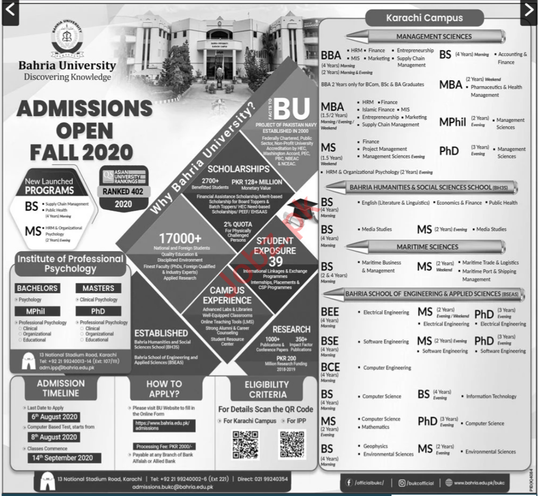 Bahria University Karachi Campus BUKC Admissions 2020 Master