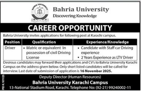 Latest Government jobs in Bahria University Karachi Campus in Driving and others can be applied till 16 November 2025 or as per closing date in newspaper ad. Read complete ad online to know how to apply on latest Bahria University Karachi Campus job opportunities.