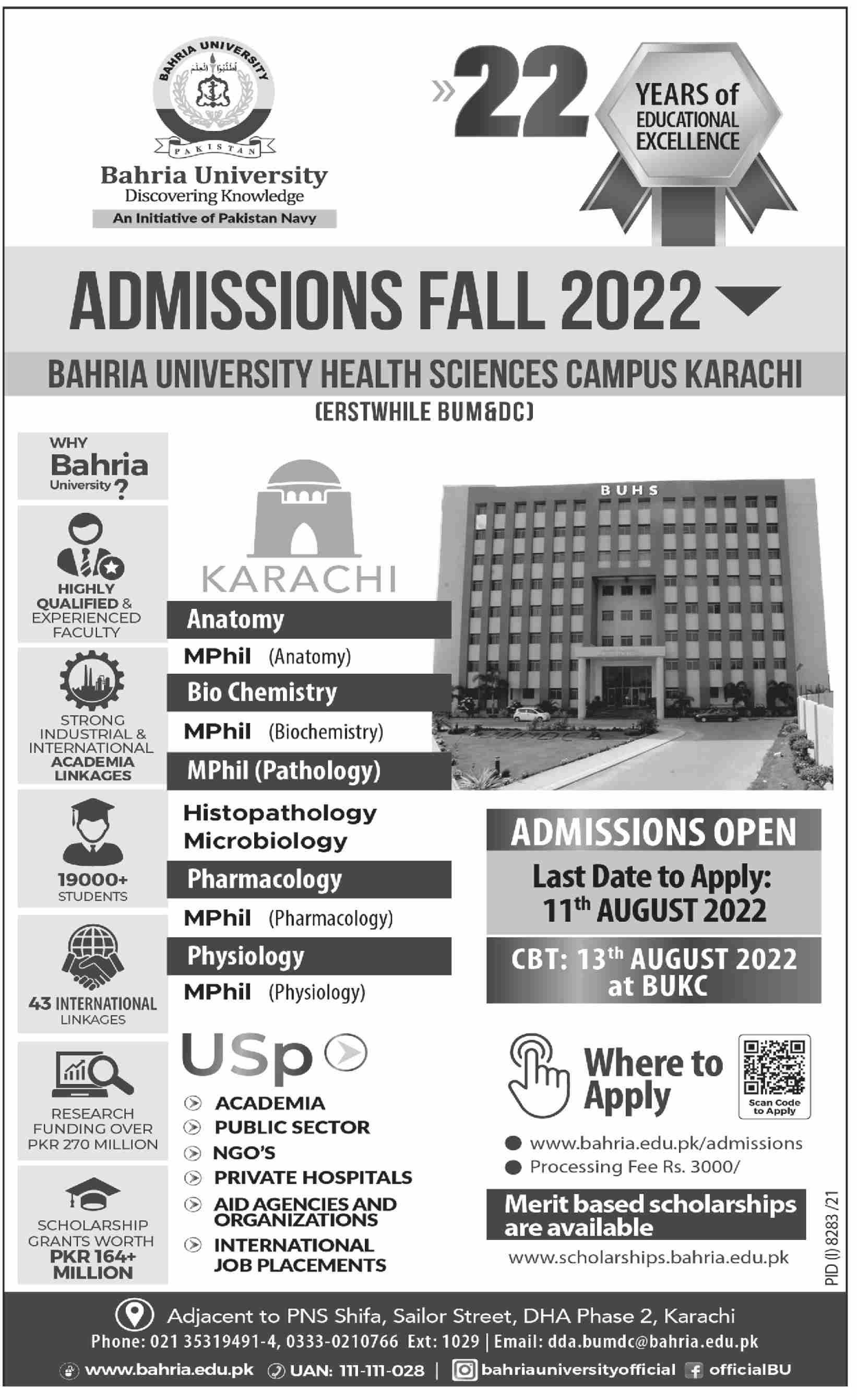 Bahria University admissions 2022 for MPhil in Anatomy, Bio Chemistry, Histopathology, Microbiology, Pharmacology, Physiology has been announced. Eligible students can apply for academic admissions 2022 in Bahria University Karachi Sindh Pakistan for Medical M. Phil. Students for admissions in Mphil can apply for online or campus classes as per Government institute criteria till admission closing date August 11, 2022. Read newspaper ad for exact details.