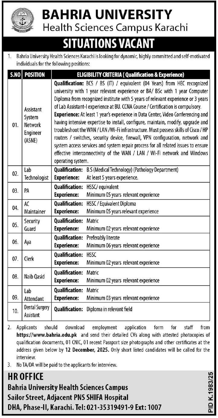 Vacant posts including Aya, Pa, Clerk, Dental Surgery Assistant, Lab Attendant, Assistant System Network Engineer, Security Guard, Lab Technologist, Naib Qasid and Ac Maintainer are announced in Bahria University Karachi Campus D.H.A Karachi, karachi Sindh Pakistan as per 8 December 2025 advertisement in daily Express Tribune Newspaper. Candidates with Master, MS and Bachelor etc. educational background will be preferred.