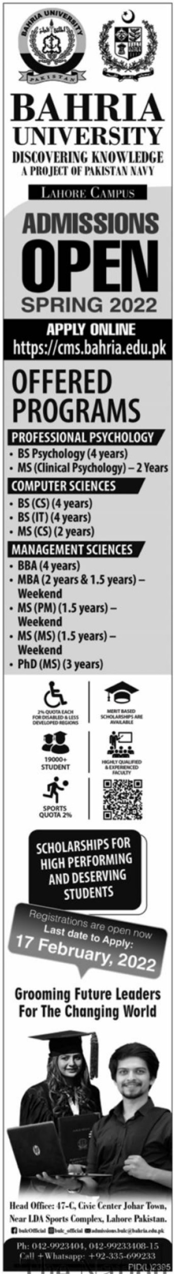 Bahria University BS Psychology, MS Clinical PSychology,BS Computer Science BSCS, BS information Technology BSIT, MS Computer Sciences MSCS, BBA Management Sciences, BBA, MBA, MBA Weekend Classes Program, MS PM, MS Management Sciences, PhD Management Sciences, admissions 2022 has been started. Bahria University Lahore Punjab Pakistan welcomes students to apply for admissions in academic year 2022 in Science University. Students who want to enroll for academic session 2022 in Pharm D, Mphil, Master, MBA, BS Hons, MS and BS qualification and admission criteria for Government institute can apply till last date 17 February 2022. Read newspaper ad for exact details.