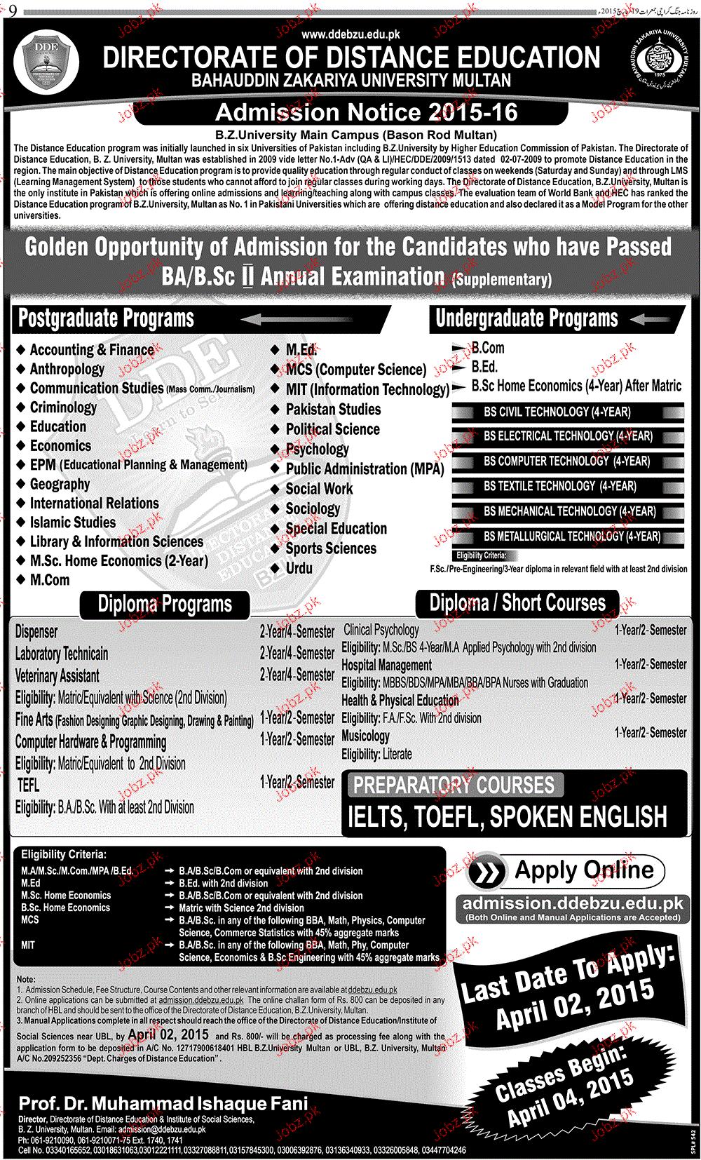 Bahuddin Zakariya University Admission in BS, MCs, MIT in Multan. Read newspaper ad for exact details.