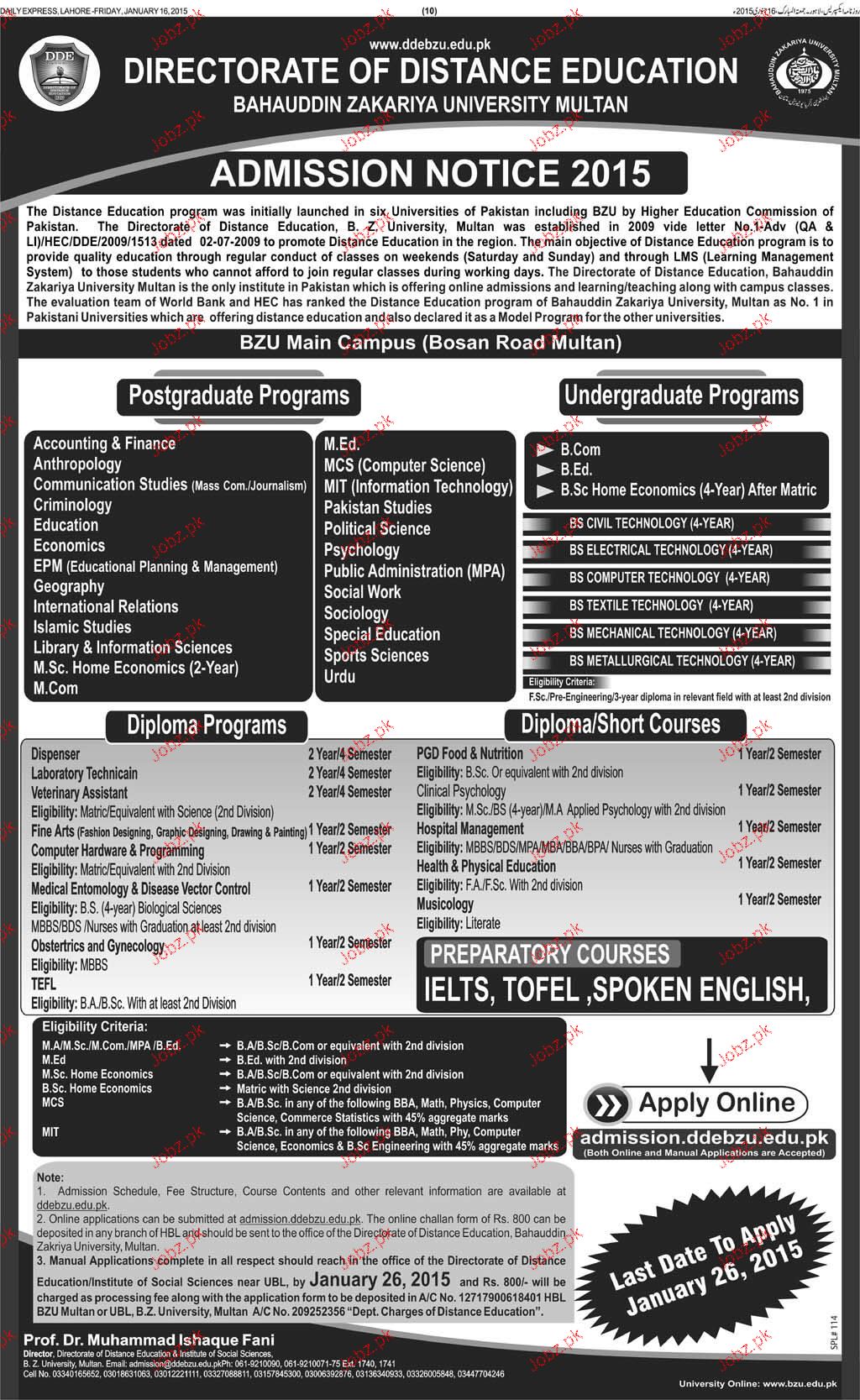 Bahuddin Zakariya University Admission in Mcs, MIT, EMP, M.Com and Diploma in Multan. Read newspaper ad for exact details.
