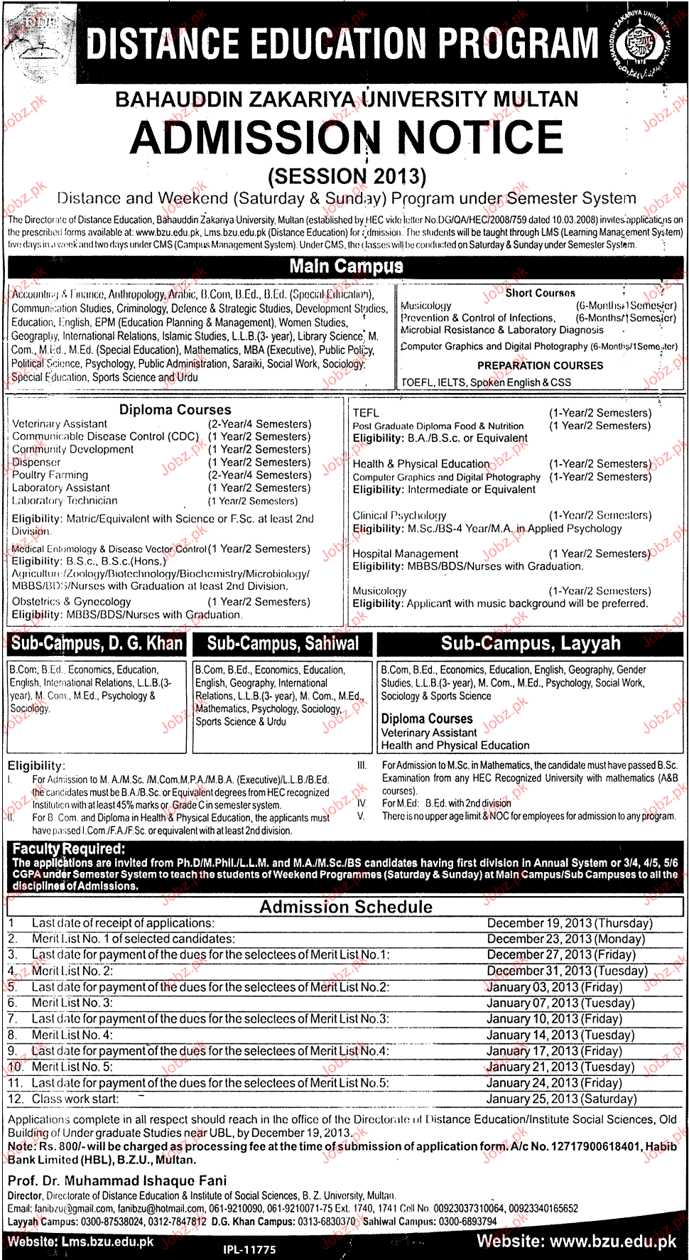 Bahuddin Zakariya University Multan Admission in Diploma in Multan Read newspaper ad for exact details.