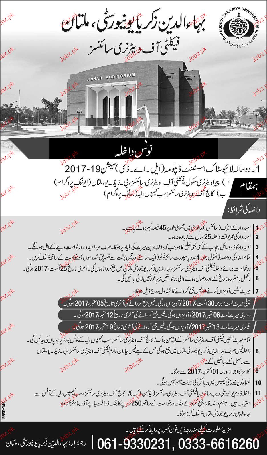 Bahuddin Zakariya University Multan Admission in Diploma in Multan. Read newspaper ad for exact details.