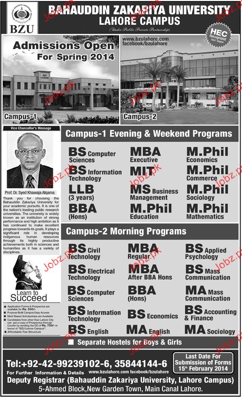 Bahuddin Zakariya Unversity Lahore Campus Admission in BS, BBA, LLB, MIT, MS and Mphill in Lahore Read newspaper ad for exact details.