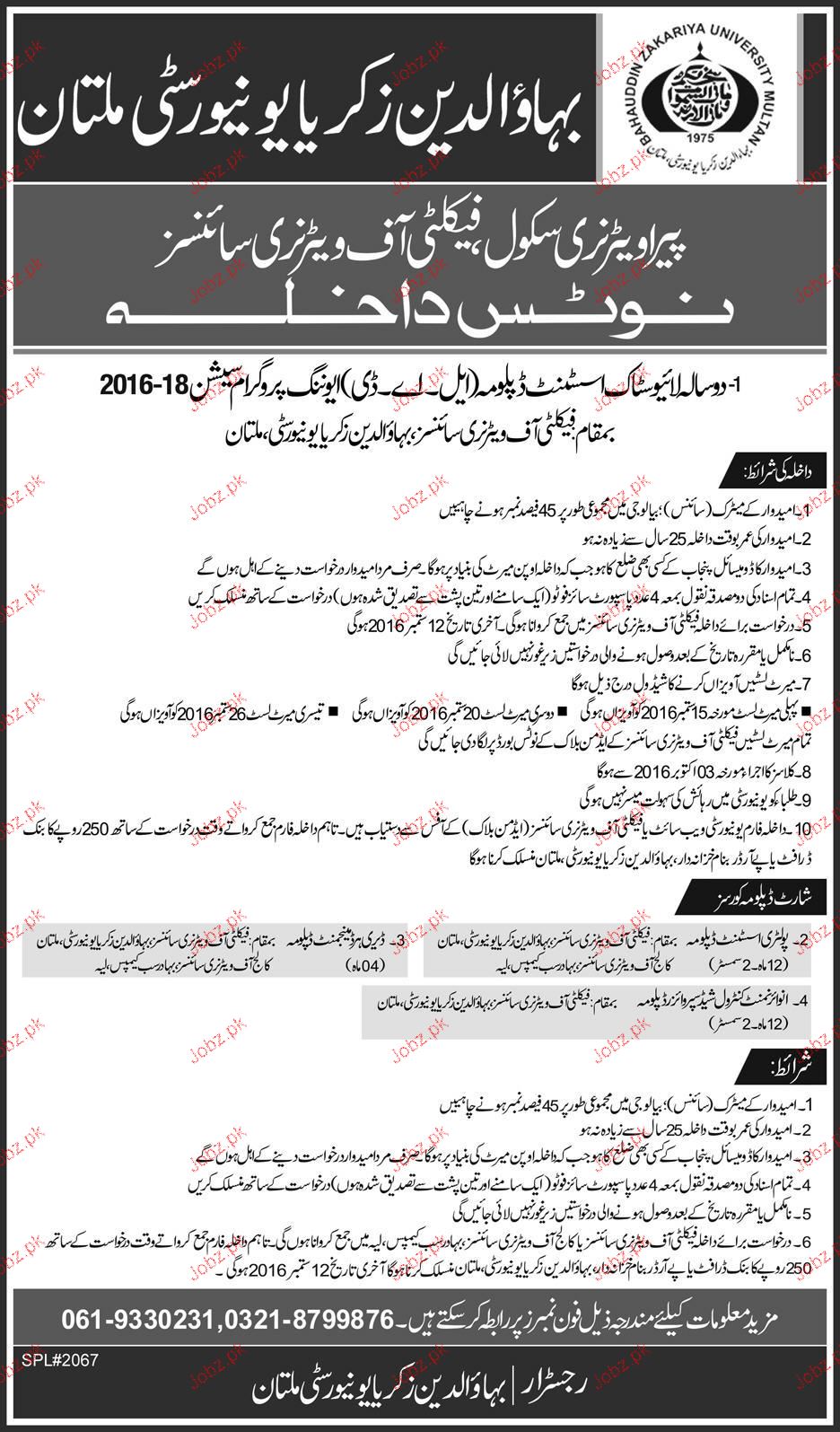 Bahuddin Zakriya University Multan Admission in Diploma in Multan. Read newspaper ad for exact details.