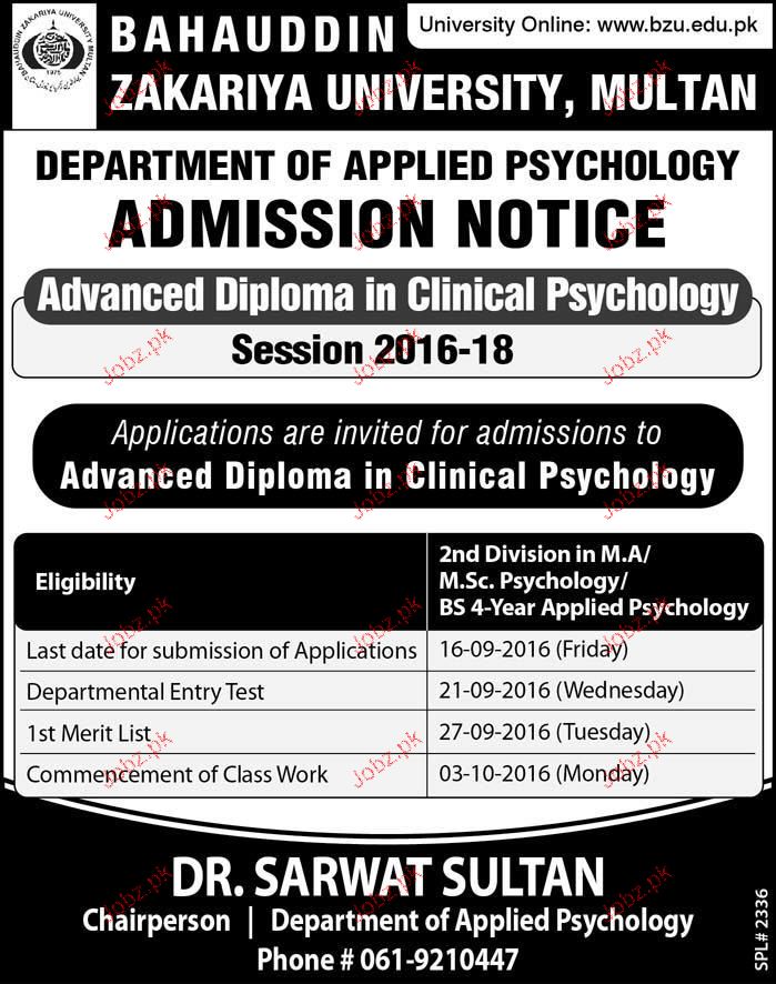 Bahuddin Zakriya University Multan Admission in Diploma in Multan. Read newspaper ad for exact details.