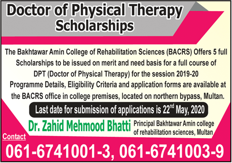 Bakhtawar Amin College of Rehabilitation Sciences BACRS Multan, Pakistan is starting admissions fall 2020 for the classes of DPT Doctor of Physical Therapy. Read newspaper ad for exact details.