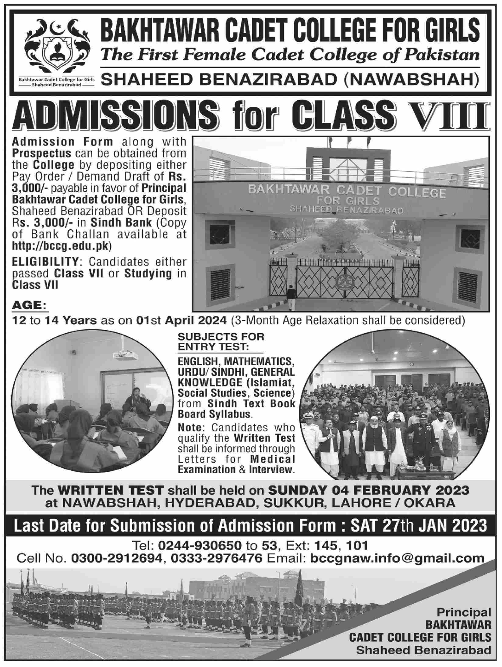 Bakhtawar Cadet College Class 8th admissions 2023 has been announced. Students can enroll for admissions in Bakhtawar Cadet College Nawabshah Sindh Pakistan for academic year 2023 to continue campus based or online education in Science College. Students for admissions in Middle can apply for online or campus classes as per Government institute criteria till admission closing date January 27, 2024. Read newspaper ad for exact details.