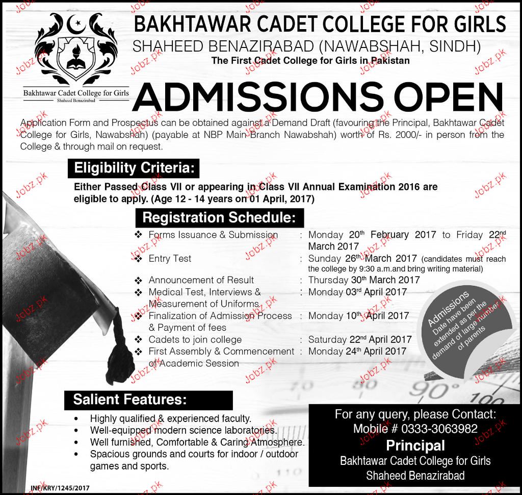 Bakhtawar Cadet College For Girls Admission in Class VII in Nawab Shah. Read newspaper ad for exact details.
