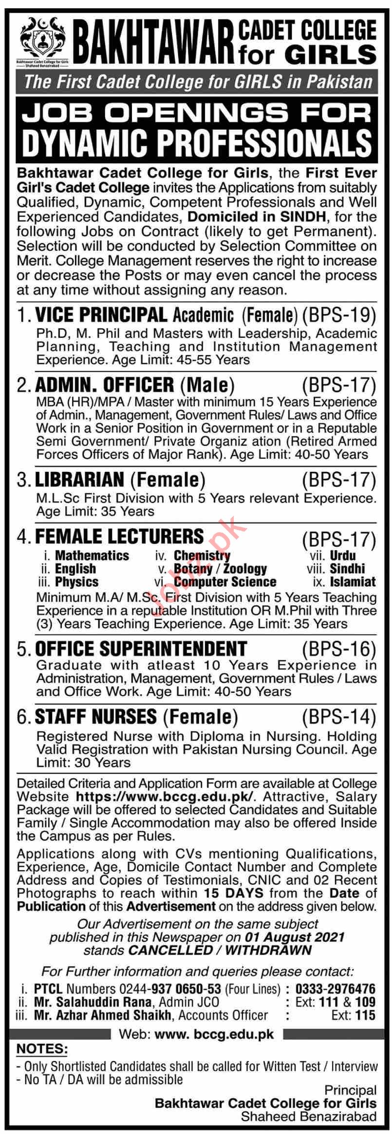 Bakhtawar Cadet College for Girls BCCG Nawabshah, Government of Pakistan is seeking candidates for the posts of Vice Principal, Female Vice Principal, Admin Officer, Librarian, Female Librarian, Lecturer, Female Lecturer, Lecturer Mathematics, Lecturer Chemistry, Lecturer English, Lecturer Botany, Lecturer Zoology, Lecturer Physics, Lecturer Computer Science, Office Superintendent, Staff Nurse, Nurse.