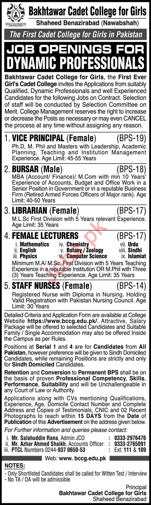 Bakhtawar Cadet College for Girls Nawabshah, Pakistan Army, Government of Pakistan needs services for Vice Principal, Female Vice Principal, Bursar, Librarian, Female Librarian, Lecturer, Mathematics Lecturer, Chemistry Lecturer, Urdu Lecturer, English Lecturer, Botany Lecturer, Zoology Lecturer, Sindhi Lecturer, Physics Lecturer, Computer Science Lecturer, Islamiat Lecturer, Staff Nurse, Female Nurse.