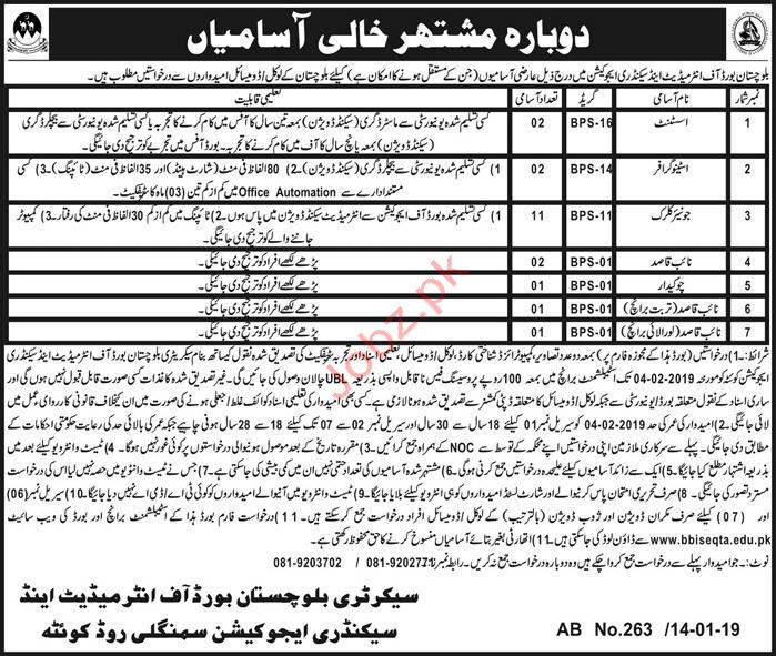 Vacancies in Balochistan Board of Intermediate & Secondary Education BBISEQTA Advertisement January 2019