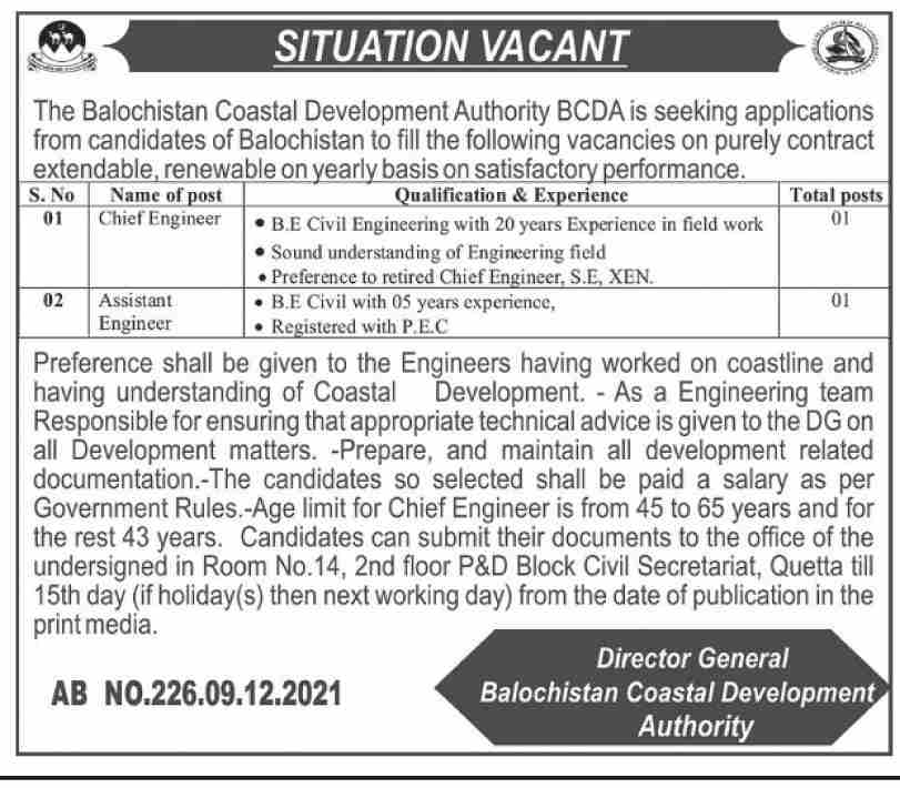 Vacancies in Balochistan Coastal Development Authority BCDA Advertisement December 2021
