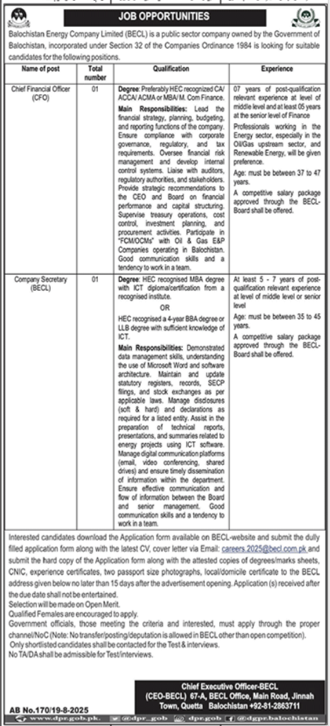 Balochistan Energy Company Limited BECL Jinnah Town Quetta, quetta Balochistan Pakistan invites applications from eligible candidates for the post of company secretary, cfo and chief financial officer as per advertisement of August 20, 2025 published in daily Jang Newspaper. Educational qualifications required MBA, CA, M.com, BBA, LLb, Others and ACCA etc.