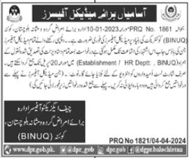 Balochistan Institute of Nephro Urology BINUQ latest Government Medical jobs and others can be applied till April 20, 2024 or as per closing date in newspaper ad. Read complete ad online to know how to apply on latest Balochistan Institute of Nephro Urology BINUQ job opportunities.