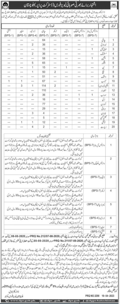 Vacant posts including driver, naiq, wireless operator, wireless mechanic, bahisti, tracker, sipahi and sweeper are announced in Balochistan Levies Force Quetta, quetta Balochistan Pakistan as per 12 April 2023 advertisement in daily Jang Newspaper. Educational qualifications required Primary, Matric and Middle etc.