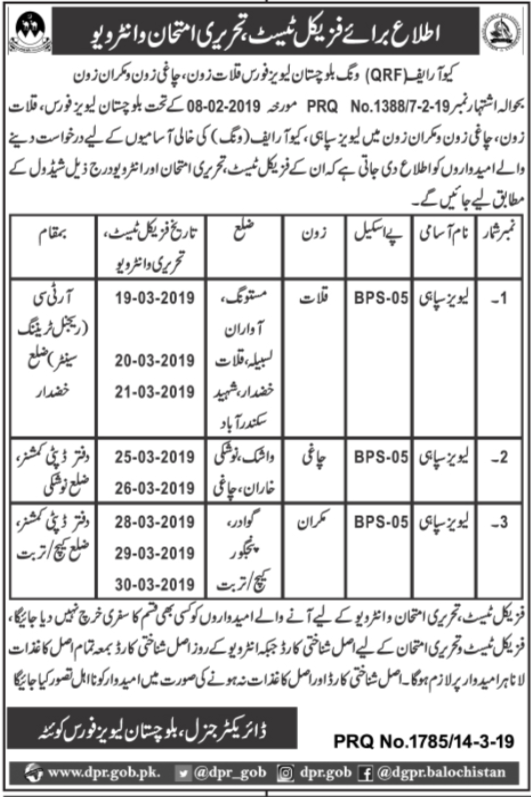 Vacancies in Balochistan Levies Force Advertisement March 2019
