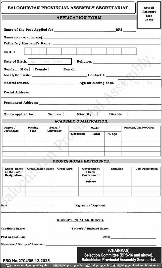 Provincial Assembly Secretariat is looking for candidates for following posts as per job advertisement published in daily Express Newspaper of December 6, 2025 for location Zarghun Road Quetta, quetta Balochistan Pakistan: