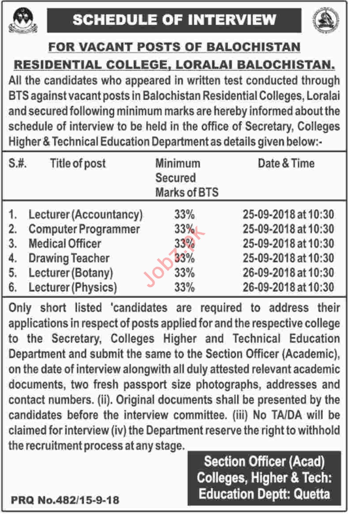 Vacancies in Balochistan Residential College Advertisement September 2018
