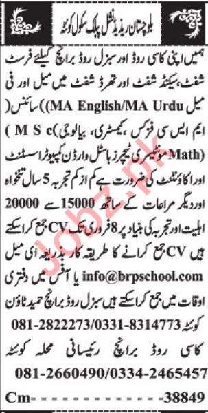 Vacancies in Balochistan Residential Public School Advertisement February 2020