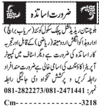 Balochistan Residential Public School jobs advertisement dated about 26 March 2022 in daily Jang Newspaper invites application for the vacant post of english teacher, urdu teacher, mathematics teacher, teacher, computer operator and accountant in Quetta, quetta Balochistan Pakistan. Preferred Education is Bachelor, Intermediate and Master etc.