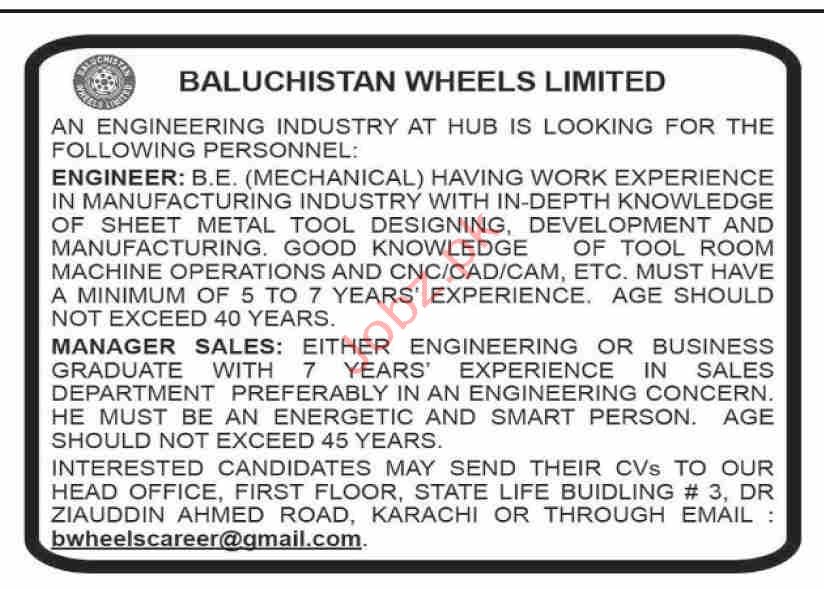 Vacancies in Baluchistan Wheels Limited Advertisement September 2019