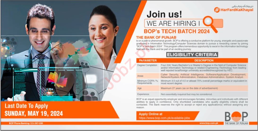 Latest Government jobs in The Bank of Punjab BOP in Bank and others can be applied till 20 May 2024 or as per closing date in newspaper ad. Read complete ad online to know how to apply on latest The Bank of Punjab BOP job opportunities.