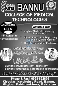 Bannu College of Medical Technologies affiliated with Khyber Medical University has announced admissions in Intermediate, FSc Pre Medical in Banny Khyber Pakhtunkhwa KPK 2020. Read newspaper ad for exact details.