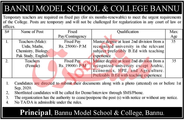 Vacancies in Bannu Model School & College Advertisement August 2020